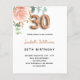 Une élégante invitation pour une fête de 30e anniversaire. Un arrière - plan blanc chic. Décoré d'or rose et de rose pastel rose vif, de fleurs roses, de feuilles d'eucalyptus verts, de sprigs, de verdure et de faux sprigs d'or. Personnalisez et le nom et les détails du parti. Lettres noires et dorées. Le nom est écrit avec un script de style moderne écrit à la main. Le numéro 30 est écrit avec une police de style ballon doré. Dos : or rose couleur arrière - plan.