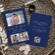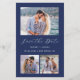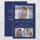 Cette simple et minimaliste carte Save the Date comporte une photo horizontale en haut et deux photos carrés en bas. Entre les deux, les mots "Save the Date" apparaissent dans un élégant script d'écriture blanche, suivi des noms du couple, date mariage et ville en sans serif police sur un arrière - plan bleu marine. Ajoutez un message plus détaillé avec des informations supplémentaires au verso, ainsi qu'un code QR pour aider vos invités à visiter votre site Web mariage.