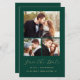 Cette simple carte d'annonce de mariage minimaliste présente un collage de photos, avec une photo horizontale en haut et deux photos carrées en dessous. Les mots "Save the Date" apparaissent dans une écriture élégante de couleur or, suivis des noms des mariés, de la date du mariage et de la ville dans une police sans empattement sur un fond vert émeraude. Ajoutez un message plus détaillé avec des informations supplémentaires au verso, ainsi qu'un code QR pour aider vos invités à visiter votre site web de mariage.