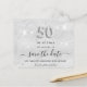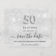 Une élégante carte Save the Date pour une fête de 50e anniversaire. Un arrière - plan métallique faux argent moderne décoré avec de la poussière de parties scintillant. Personnalisez et ajoutez une date et un nom/âge. Lettres de couleur grise. Le texte : Save the Date est écrit avec un grand script de style à la main tendance. Numéro 50 avec une police de style ballon.