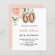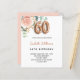 Une élégante invitation pour une fête de 60e anniversaire. Un arrière - plan blanc chic. Décoré d'or rose et de rose pastel rose vif, de fleurs roses, de feuilles d'eucalyptus verts, de sprigs, de verdure et de faux sprigs d'or. Personnalisez et le nom et les détails du parti. Lettres noires et dorées. Le nom est écrit avec un script de style moderne écrit à la main. Le numéro 60 est écrit avec une police de style ballon doré. Dos : or rose couleur arrière - plan.