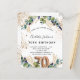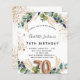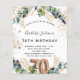 Pour une fête de 70e anniversaire. Un arrière - plan blanc décoré de verdure d'eucalyptus et de feuilles dorés. Taches de fausse parties scintillant dorée. Personnalisez et ajoutez vos noms et les détails du mariage. Lettres noires et dorées. Le numéro 70 est écrit avec une police de style ballon. Dos : taches d'arrière - plan blanc et taches de faux parties scintillant doré.