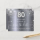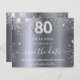 Une élégante carte Save the Date pour une fête de 80e anniversaire. Un arrière - plan métallique faux argent moderne, décoré avec de la poussière de parties scintillant. Personnalisez et ajoutez une date et un nom/âge. Le texte : Save the Date est écrit avec un grand script de style à la main tendance. Numéro 80 avec une police de style ballon.