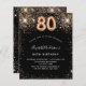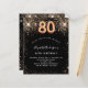 Une invitation moderne, élégante et glamour pour une fête de 80e anniversaire. Un arrière - plan noir décoré de faux parties scintillant. Le nom est écrit avec un script de style à la main de couleur dorée moderne. Personnalisez et ajoutez les détails de votre fête. Le numéro 80 est écrit avec une police de style ballon, script.