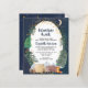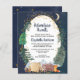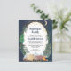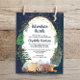 Baby shower rustique abordable par courriel avec une mignonne illustration d'animaux boisés avec leur tente campant dans les montagnes et la forêt, une superposition d'étoiles d'or et de lune dans un ciel nocturne et "Adventure Awaits" et le nom de la future mère dans un sombre script bleu minuit. Personnalisez facilement la douche par mail.
