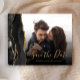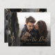 Cette élégante carte de date horizontale comporte une bordure d'aquarelle noire découpée avec une fausse parties scintillant d'or. Remplacez facilement l'exemple d'image par votre propre photo du futur marié et marié. Le texte personnalisable combine un script d'écriture manuscrite de couleur or et une police de cuivre ; un filtre en dégradé noir aide à faire apparaître le texte. Le dos est assorti d'un design d'agate noir et or.
