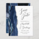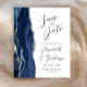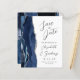 Le bord gauche de cet élégant mariage moderne, à l'exception de la carte de date, est doté d'une bordure en aquarelle bleu marine ornée d'une parties scintillant en faux argent. Le texte personnalisable combine écriture manuscrite grise au fusain, cuivre et polices italiques sur un arrière - plan blanc. L'envers est assorti d'un design d'agate marine et argenté.