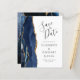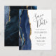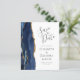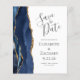 Le bord gauche de cet élégant mariage moderne, à l'exception de la carte de date, est doté d'une bordure en aquarelle bleu marine ornée d'une parties scintillant en faux or. Le texte personnalisable combine écriture manuscrite grise au fusain, cuivre et polices italiques sur un arrière - plan blanc. L'envers est assorti d'un design d'agate bleu marine et or.