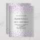 Une invitation moderne, élégante et glamour pour la fête du 30e anniversaire d'une femme (ou de n'importe quel âge). Un faux arrière - plan métallique à l'apparence argentée avec une fausse parties scintillant violette chute. Le nom est écrit avec un script de style moderne et noir écrit à la main. Personnalisez et ajoutez un nom, un âge et des détails de la fête.