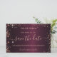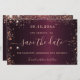 Une carte moderne Save the Date pour une fête d'anniversaire de 50e (ou de n'importe quel âge). Une couleur arrière - plan à l'aspect faux métallique bordeaux. Décoré avec de la poussière de parties scintillant en faux or rose. Le texte : Save the Date est écrit avec un grand script de style à la main tendance.