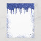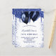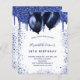 Une invitation à la fête d'anniversaire de 18e anniversaire, féminine et féminine (ou tout âge). Devant : Un arrière - plan blanc. Décoré avec des gouttes de parties scintillant bleu marine, l'apparence de la peinture goutte à goutte et des ballons. Personnalisez et ajoutez un nom et des détails du parti. Le nom est écrit avec un script de style écrit à la main.