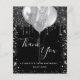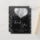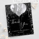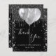 Un carte de remerciements pour un 18ème anniversaire (ou tout âge). Une couleur arrière - plan noire chic. Avec des gouttes de parties scintillant en faux argent, la peinture goutte à goutte et les ballons. Sur l'avant, script écrit et texte : Merci, votre texte, titre et une date. Retour : Personnalisez et ajoutez votre note de remerciement et votre nom.