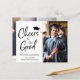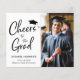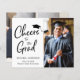 Moderne et abordable 2 photo graduation carte faire-part. Sur le devant, la photo de votre diplômé est à côté de "Cheers to the Grad" écrit dans un script moderne avec un grand casquette sur le dessus. Vous pouvez facilement personnaliser avec leur nom et leur école, et ajouter une autre photo au dos.