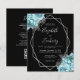 This elegant modern wedding invitation features a silver geometric frame decorated with aqua and silver flowers on a black background. The customizable text combines silver gray whimsical handwriting, copperplate and italic fonts. Add additional details on the back, along with a QR code to help your guests visit your wedding website.