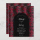Ce design élégant présente une image d'arrière-plan d'humeur de motif de damas floral en faux velours vintage en bordeaux et noir. Personnalisez-le avec les noms de la mariée et du marié en écriture calligraphique gris argenté et le texte restant dans une combinaison de sans empattement, copperplate et italique sur une forme d'arc noir. Un motif de damas assorti apparaît au verso.