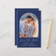 Cette simple et minimaliste carte Save the Date comporte une photo verticale en forme d'arc au-dessus des mots "Save the Date" en élégant script d'écriture manuscrite blanche, suivie des noms du couple, date mariage et ville en sans serif police sur un arrière - plan bleu marine. Ajoutez un message plus détaillé avec des informations supplémentaires sur le dos.