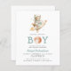 This cute baby shower invitation features a watercolor teddy bear astronaut riding a rocket ship above the words "Houston we have a BOY," with a watercolor planet replacing the "O" in "BOY." Personalize the text with the name of the mom-to-be in blue-green and the details in charcoal gray sans serif font. The reverse side provides space for diaper raffle, books for baby, and registry details, along with a convenient QR code guests can scan to visit the registry. Ideal for a boy's baby shower.