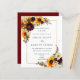 Des tournesols dorés, des roses rouges foncées et des fleurs d'hydrangée blanche en ivoire sont nichés dans les feuilles et les baies d'automne. Elles décorent un cadre doré qui entoure vos détails de douche nuptiale. Le dos de l'invitation à la douche nuptiale est rouge bordeaux profond. Cet article est en coordination avec la collection de Mariages de Tournesol et Bourgogne. Il contient les modèles dont vous avez besoin pour créer une suite de faire-part de mariage, des panneaux de mariage et des fournitures de réception.