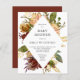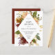 Une belle invitation au baby shower rustique avec un bouquet floral aquarelle dans les tons d'automne paprika, orange, bordeaux, marron, or, rose, pêche, rouille, ivoire et crème encadrant le texte gris foncé en forme de losange ou lozenge blanc. L'inverse est une teinte bordeaux assortie. Idéal pour un baby shower d'automne.