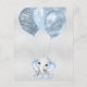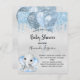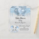 Pour un baby shower, célébrer un bébé garçon. Un arrière - plan métallique à l'aspect faux argenté. Décoré avec des gouttes de faux parties scintillant bleu, l'air dérapant de peinture, des ballons et un mignon petit garçon d'éléphant. Personnalisez et ajoutez le nom de la mère à être le nom et les détails de la fête. Le nom et le texte : Baby shower sont écrits avec un script de style écrit à la main