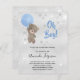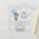Pour un baby shower célébrant un bébé garçon. Un arrière - plan métallique à l'aspect faux argenté. Un ours en peluche tenant un ballon bleu étoiles et une fausse poussière de parties scintillant. Personnalisez et ajoutez le nom de la mère à être et les détails de la fête. Le nom et le texte : Oh Boy! sont écrits avec un script de style écrit à la main