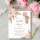 Pour un baby shower de style boho moderne. Arrière - plan blanc à l'avant. Décoré de fleurs roses d'or et de rose, de roses, d'herbe de pampas et d'une nana en peluche tenant un ballon rose. Personnalisez et ajoutez un nom et des détails du parti. Dos : Un arrière - plan rose, rustique rose roux faux métallique à l'aspect .