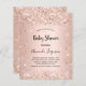 Pour un baby shower, célébrer une petite fille. Un arrière - plan rose à l'apparence métallique. Décoré d'or rose, de faux parties scintillant rose. Personnalisez et ajoutez le nom de la mère à être et les détails de la fête. Le nom et le texte : Baby shower sont écrits avec un script de style écrit à la main