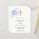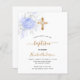 Pour un baptême élégant, célébrer un bébé garçon. Un arrière - plan blanc chic. Décoré de fleurs bleu clair et blanc, de roses et d'une fausse croix d'or. Personnalisez et ajoutez le nom de l'enfant et les détails. Lettres noires et dorées.