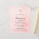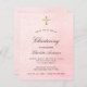 Un baptême moderne et élégant, célébrant une petite fille. Un arrière - plan rose vif décoré de petits étincelles dorées, de points et d'une croix dorée. Personnalisez et ajoutez un nom et des détails du parti. Lettres de couleur noire. Élégant script