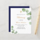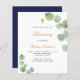 Un arrière - plan blanc décoré de verdure d'eucalyptus et d'une croix dorée. Personnalisez et le nom des enfants et les détails de la cérémonie. Lettres noires et dorées. Retour : arrière - plan bleu marine.