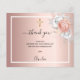 Un carte de remerciements élégant avec photo. Un arrière - plan à l'apparence métallique rose, un cadre blanc, des roses d'or rose, des fleurs. Une croix d'or. Personnalisez et ajoutez une note de remerciement, photo de la petite fille et nom. Texte noir.