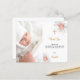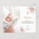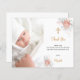 Une carte de remerciements de baptême moderne et élégante. Un arrière - plan blanc chic décoré d'or rose et de fleurs blanches. Personnalisez et ajoutez votre photo de l'enfant, merci note et nom.