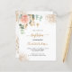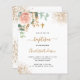 Un arrière - plan blanc décoré de verdure d'eucalyptus, d'or rose et de rose rose rousse, de feuilles dorés et de parties scintillant faux or en chute libre. Personnalisez et le nom des enfants et les détails de la cérémonie. Lettres noires et dorées. Retour : arrière - plan blanc avec gouttes de parties scintillant en faux or