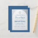 Un bar mitzvah invitation. Sur un arrière - plan rectangulaire bleu classique, il a une arche fausse feuille argent qui a à l'intérieur du texte bleu sur arrière - plan blanc. Le nom est écrit dans un élégant script calligraphique;. Il y a une (fausse) étoile d'argent de David au-dessus du texte.