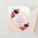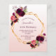 Sur le devant : Une invitation pour une fête d'anniversaire de 40e (ou tout âge). Un or rose élégant et tendance, arrière - plan à dégradé blanc avec un cadre géométrique en faux or. Décoré de fleurs violettes foncées et bordeaux, de plumes roses et boho. Modèles pour un nom et les détails de la fête. Le nom est écrit avec un script de style écrit à la main, des lettres de couleur violette. Dos : or rose, arrière - plan blanc dégradé.