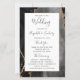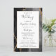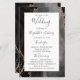 This elegant, modern wedding program features a black agate background trimmed with gold faux glitter. The text appears in elegant charcoal gray handwriting and copperplate fonts on a white rectangle.