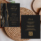Économisez le coût d'impression et d'envoi de cartes RSVP séparées avec cet élégant faire-part de mariage tout-en-un moderne. Le bord gauche est doté d'une bordure en aquarelle noire recouverte d'une fausse parties scintillant dorée. Le texte personnalisable combine écriture manuscrite dorée, cuivre et polices italiques sur un arrière - plan noir ardoise. L'envers offre de l'espace pour les détails mariages sur un arrière - plan noir en ardoise solide, ainsi qu'un code QR que les invités peuvent scanner pour visiter votre site Web et RSVP. REMARQUE : Les enveloppes ne sont pas automatiquement incluses dans ces invitations budgétaires, alors n'oubliez pas de choisir l'option "enveloppes blanches" !