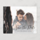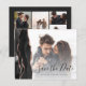 Cette élégante carte de date horizontale comporte une bordure d'aquarelle noire découpée avec une parties scintillant d'or rose. Remplacez facilement l'échantillon d'images par vos propres photos de la future mariée et mariée. Le texte personnalisable combine un script d'écriture manuscrite en noir et une police de cuivre sur votre photo à l'avant ; un filtre en dégradé blanc aide à faire apparaître le texte. L'arrière fournit des espaces pour cinq photos supplémentaires, ainsi que de la place pour l'URL de votre site Web mariage ou d'autres brefs messages en rose texte rose sur un arrière - plan non noir.