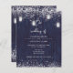 Budget, bocal bleu rustique en mason faire-part de mariage avec des lampes à cordes.