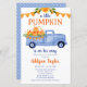Cet adorable, garçon, invitation de baby shower budget de 5,5 po x 8,5 po avec un pick-up bleu aquarelle chargé de citrouilles d'automne serait parfait pour votre douche! C'est fabuleux pour un baby shower d'automne ou de temps de récolte. Il a un dos bleu souple coordonné avec de minuscules pois blancs. Tellement mignon pour accueillir un nouveau bébé doux !