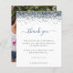 Parties scintillant bleue Peacock Budget Fête des mariées photo Merci. Un prix économique PETIT 4,5 po x 5,6 po alternatif. Disponible dans un STOCK SEMI-GLOSS 110 lb CARD qui est l'option par défaut (plus épais pour les invitations), OU un STOCK SATIN FINISH 80 lb THINNER PAPER (idéal pour les boîtiers). Les enveloppes sont en option et légèrement plus grandes que la taille de la carte. Une bordure en faux parties scintillant bleu paon est en haut, et le Merci est dans un script de style manuscrit. Personnalisez facilement le texte à vos propres détails. Sur le dos swap dans votre photo préférée de votre douche d'orientation portrait.