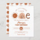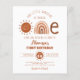 Une invitation de budget pour un premier anniversaire bohème rustique moderne avec des éléments de soleil et d'arc-en-ciel aquarelle aux tons terre cuite.