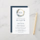 Ce design mariage boho présente les initiales monographiques de mariée et mariée encadrées d'une couronne d'aquarelle qui comprend une lune bleue indigo, une pelouse pampa, des fleurs blanches et un cercle en faux feuille d'or. Personnalisez le texte bleu foncé avec les noms du couple et les détails du mariage. L'envers est une solide nuance de bleu foncé.