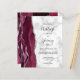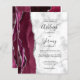 Le bord gauche de cette élégante faire-part de mariage moderne est orné d'une bordure d'aquarelle bordeaux et d'une fausse parties scintillant argentée. Le texte personnalisable combine écriture manuscrite, copperplate et polices italiques en noir sur un arrière - plan gris et blanc en marbre. L'envers est assorti d'un design d'agate bordeaux et argenté.