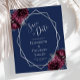 Cet élégant mariage moderne, à l'exception de la carte datation, présente un cadre géométrique argenté orné de bouquets floraux bordeaux et argentés sur un arrière - plan bleu marine. Le texte personnalisable combine écriture fantaisie gris argenté, cuivre et polices italiques.