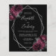 Cette élégante faire-part de mariage moderne présente un cadre géométrique argenté orné de fleurs bordeaux et argentées sur un arrière - plan noir. Le texte personnalisable combine écriture fantaisie gris argenté, cuivre et polices italiques. L'envers offre de l'espace pour les détails du mariage, ainsi qu'un code QR que les clients peuvent scanner pour visiter votre site Web et RSVP, ce qui permet d'économiser le coût d'impression et d'envoi de cartes RSVP séparées.