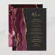 Le bord gauche de cet élégant menu mariage moderne comporte une bordure d'aquarelle rouge bordeaux ornée d'une parties scintillant en faux or. Le texte personnalisable combine un script d'écriture manuscrite de couleur or et des polices de cuivre sur un arrière - plan non noir. L'envers est assorti d'un design d'agate bordeaux et or.