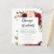 ** LE PAPIER SATIN EST PAPIER MINCE. METTEZ À NIVEAU LE PAPIER POUR UN PAPIER PLUS ÉPAISSE. A UNE OPTION POUR ENVELOPPES. *** Économisez de l'argent sur les invitations officielles avec cette petite invitation qui a une option pour les enveloppes. Changez les plans pour votre mariage avec cette Invitation Florale & blanche de Bourgogne Marsala. Petite version. Vous voulez une version plus grande ? Consultez notre collection de mariages de Burgundy Marsala pour les cartes. https://www.zazzle.com/collections/change_cancel_delay_wedding_announcements-119305647416996151?rf=238937196885903396
