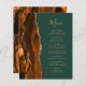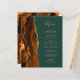 Le bord gauche de cet élégant menu mariage moderne comporte une bordure d'aquarelle orange brûlée et ornée d'une parties scintillant en faux or. Le texte personnalisable combine écriture manuscrite couleur or et polices de cuivre sur un arrière - plan vert émeraude foncé. L'envers est assorti d'une agate orange brûlée et dorée.