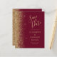 Le bord gauche de cet élégant mariage moderne, à l'exception de la carte de date, est orné d'une bordure de parties scintillant en faux or. Le texte personnalisable combine écriture manuscrite couleur or pâle, cuivre et polices italiques sur un arrière - plan rouge bordeaux. L'envers est assorti d'un design bordeaux et doré.